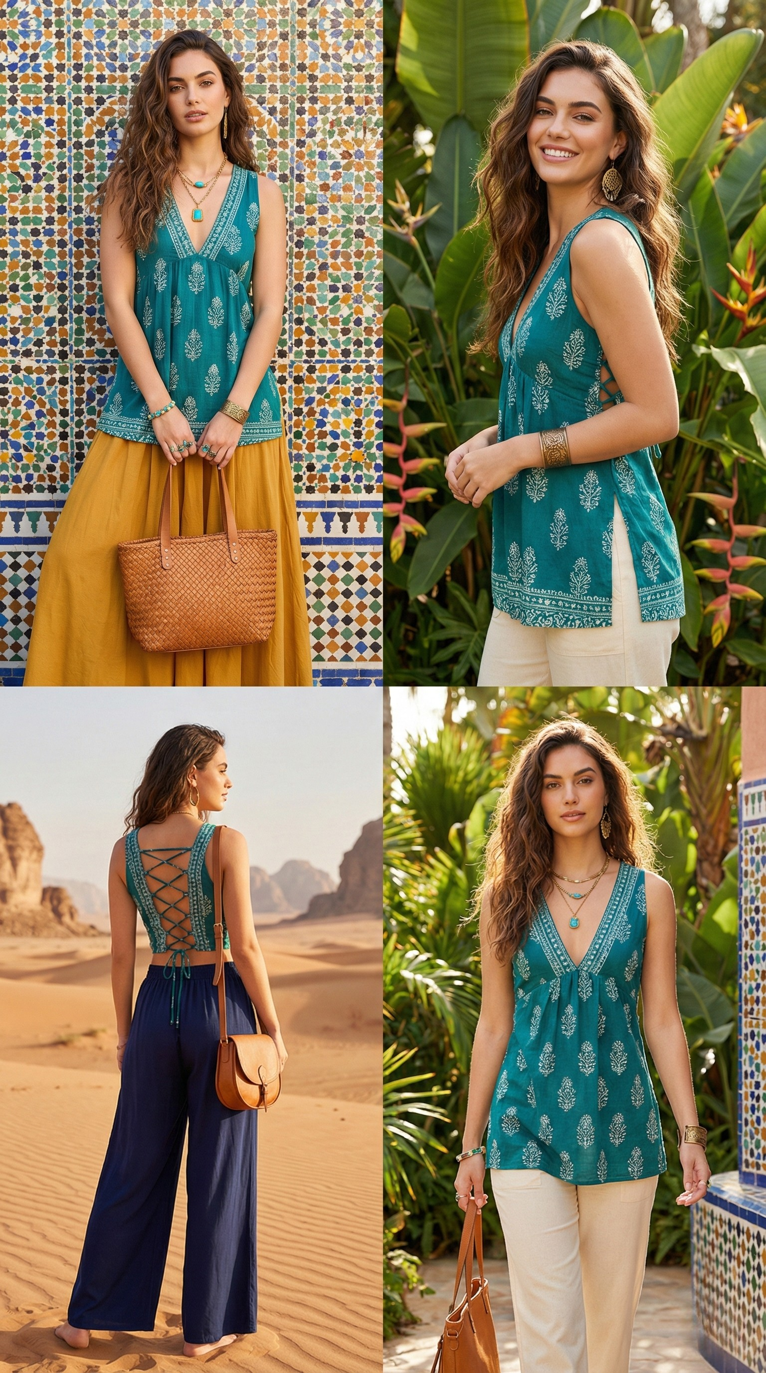 Whether you're exploring colorful mosaic-filled courtyards, walking through tropical gardens, or watching the desert sun set over golden sands, this top blends seamlessly into every mood and moment. It’s the perfect combination of bohemian charm and ethnic artistry.